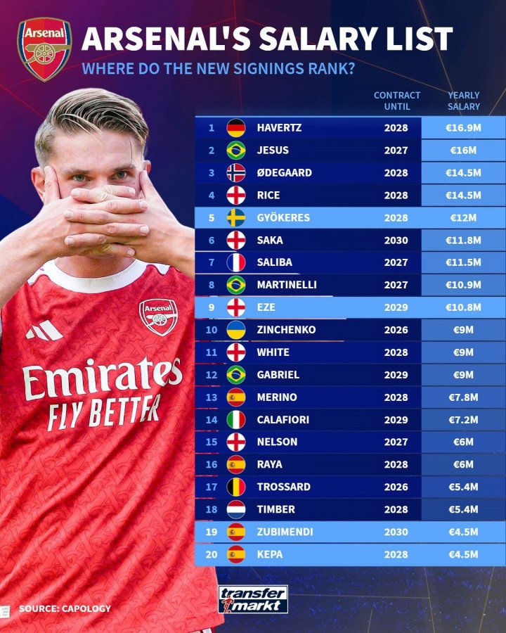 德转列阿森纳球员年薪排行: 哈弗茨1690万欧居首, 约克雷斯第五 |